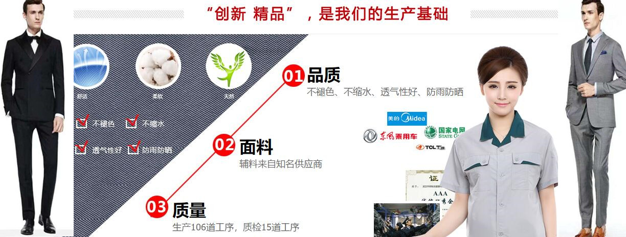 專業(yè)訂做高端定制西服、企業(yè)員工制服、酒店 、酒樓、KTV、工廠 、公司企業(yè) 、銷售案場 、物業(yè)、學(xué)校等……只要您一個(gè)電話,我們會完美的為你解決服裝需求,為您企業(yè)塑造完美形象。